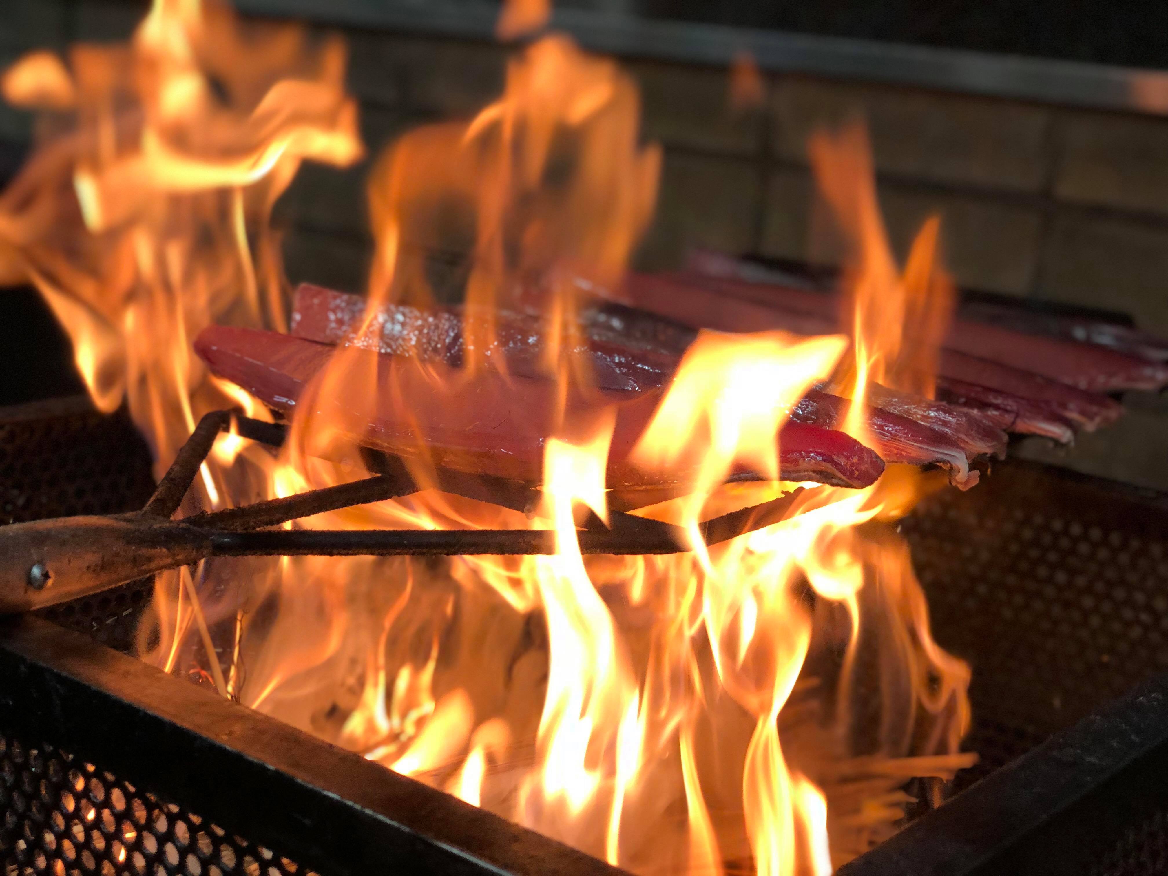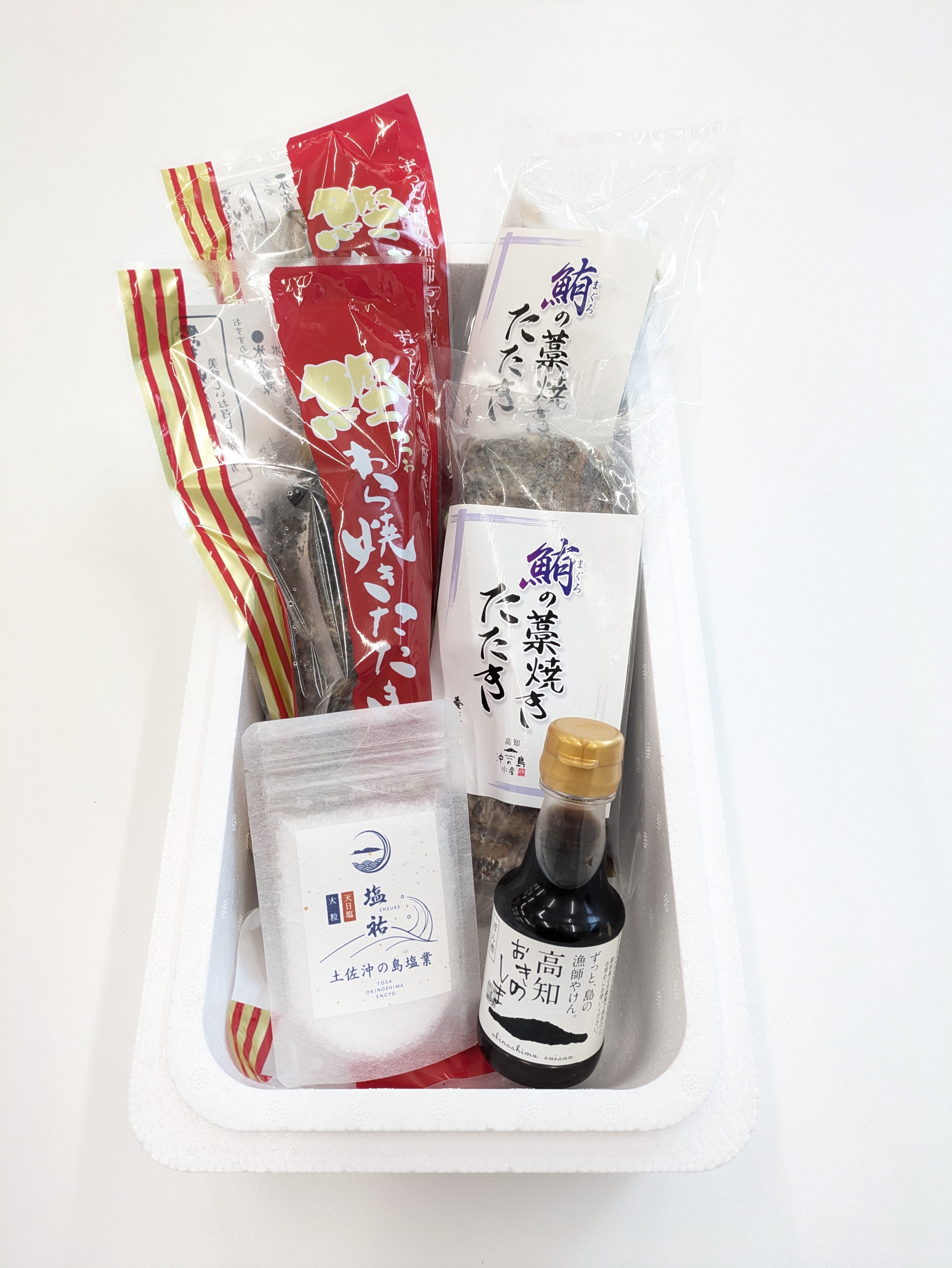 豪快に藁焼きした本マグロと当社自慢のかつおの藁焼きたたきをセットにしました。高知県宿毛市沖の島の綺麗な海水から産み出される土佐沖の島塩業、渾身の天日塩と当社オリジナルのぽん酢でお召し上がりください。